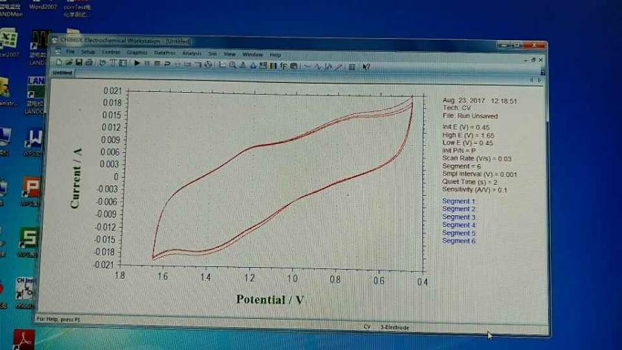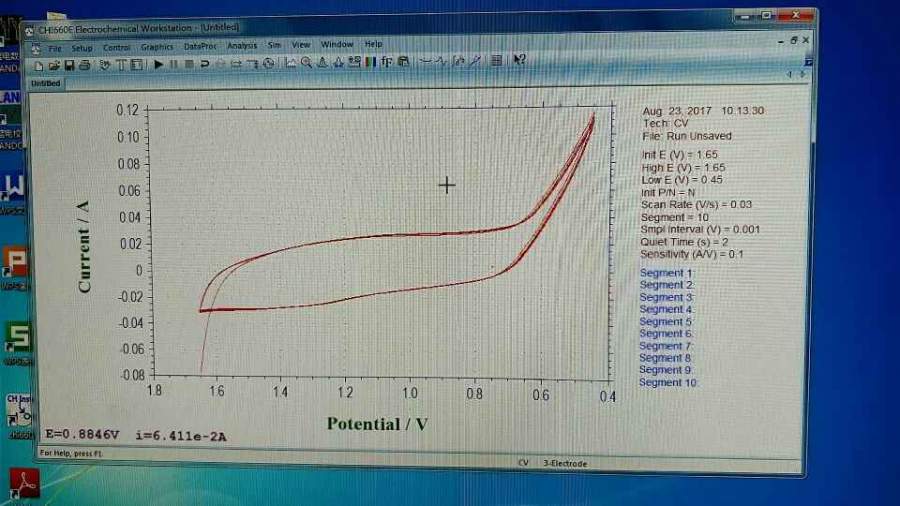 我用钒(IV)溶液0.2 M通电氧化成钒(V)金黄色溶液。用五价来进行三电极扫CV。出来图是如下右边一个尖锥形状没有峰额。。。然后用同样三电极扫钒(IV)0.2 M溶液出来如图二,也没有峰额。。请教各位大神,是怎么回事哦? 发自小木虫Android客户端 |