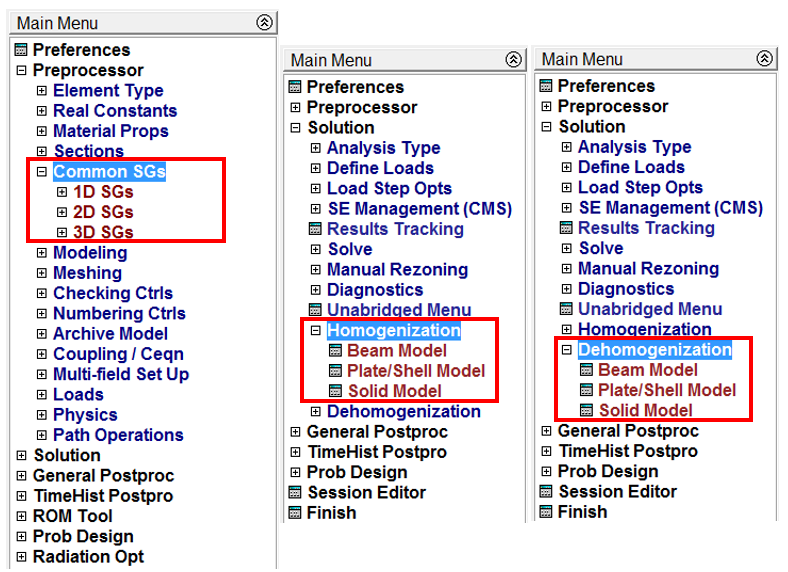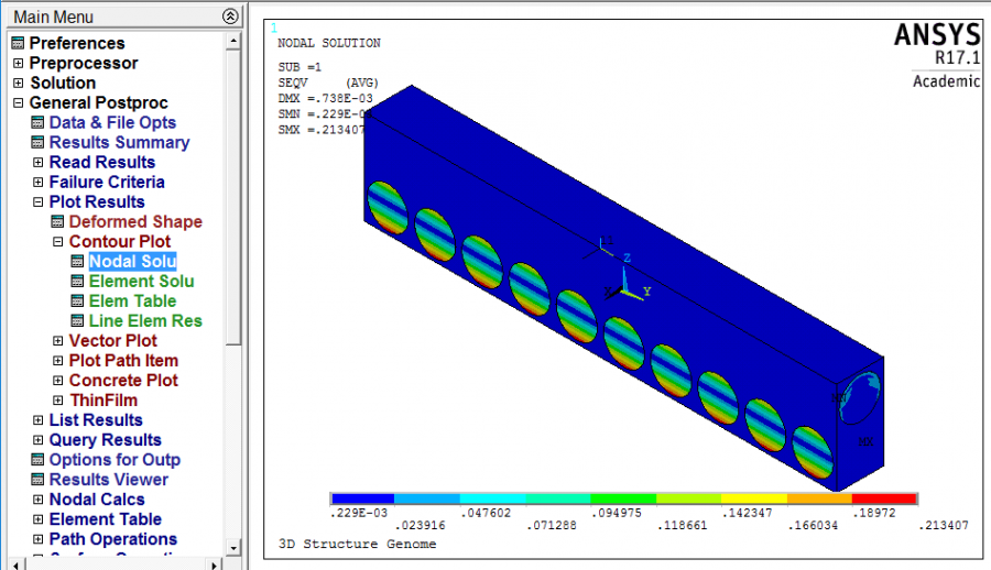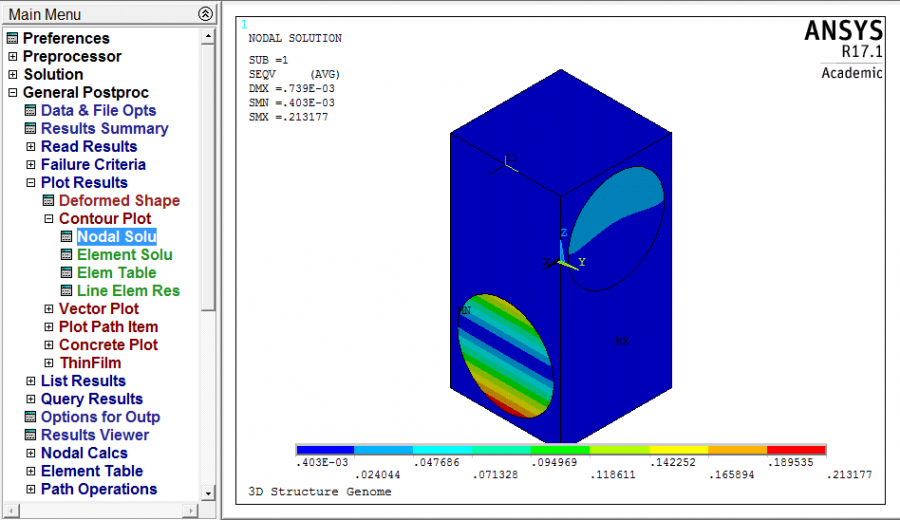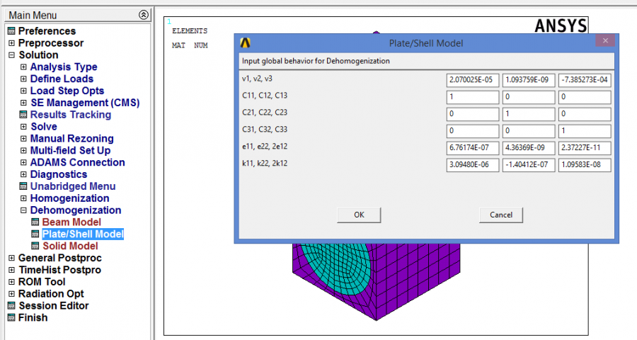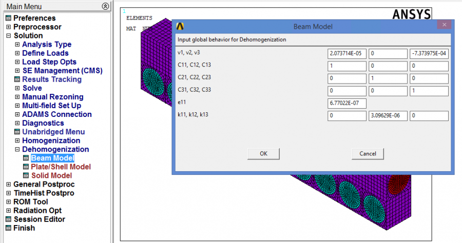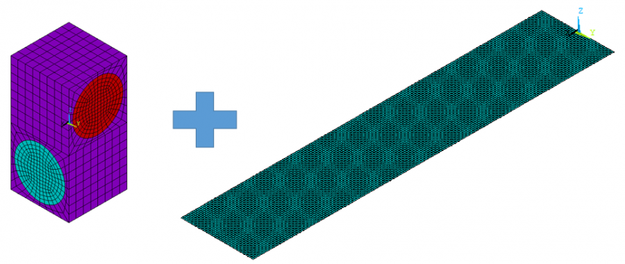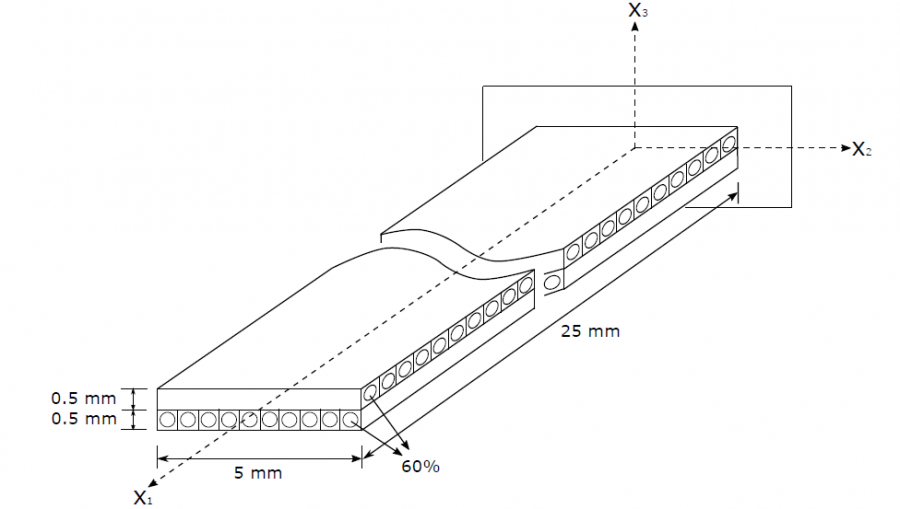 本文介绍一个基于UIDL和APDL的ANSYS二次开发实例:ANSYS-SwiftComp GUI。SwiftComp是AnalySwift公司的软件,可以用于复合材料仿真。 本文运用UIDL和APDL,在ANSYS里为SwiftComp创建了用户界面,如下图所示:(新创建的菜单由红色方框框出)(没有显示的图片通过附件上传了) ![]() 新创新的菜单有:Common SGs, Homogenization, Dehomogenization 它们在Main Menu里的显示由UIDL控制,对应的UIDL文件如下图所示: ![]() 新创建的功能有:1D SG: Fast Generate, Advanced Generate, Input File. 2D SG: Beam Section, Square Pack, Hexagonal Pack. 3D SG: Square Pack, Spherical Inclusion, Honeycomb. Homogenization: Beam Model, Plate/Shell Model, Solid Model. Dehomogenization: Beam Model, Plate/Shell Model, Solid Model. 它们功能的实现由APDL控制,对应的APDL文件如下图所示: ![]() ANSYS-SwiftComp GUI可以用于多尺度结构仿真,对复合材料仿真特别合适。 这个二次开发所有的文件和说明,均可以在cdmHUB上免费下载(需要注册):https://cdmhub.org/resources/1136 ANSYS-SwiftComp GUI的介绍和实例可以在我的领英上查看:https://www.linkedin.com/pulse/a ... deling-banghua-zhao 下面通过一个实例介绍ANSYS-SwiftComp GUI: Example Problem ANSYS-SwiftComp GUI in principle can be used for multiscale constitutive modeling of any structures. We are using a simple example to demonstrate some of its features. As shown in Figure 2, an artificial, unidirectional fiber reinforced composite is made of graphite fiber and epoxy matrix. The fiber can be assumed to be transversely isotropic with E1 = 276 GPa, E2 = E3 = 19.5 GPa, G12 = G13 = 70 GPa, ν12 = ν13 = 0.28, ν23 = 0.70. The epoxy matrix can be assumed to be isotropic with E = 4.76 GPa and ν = 0.37. A laminate is made of a 0-degree ply on the bottom and a 90-degree ply on the top. Assuming the bottom layer contains 10 fibers and the top layer contains 50 fibers. The microstructure can be assumed as square packing with fiber volume fraction equal to 60%. Note the lines between unit cells in Figure 2 are artificial and they are used to show the unit cell. The length of the laminate is 25 mm, and the width is 5 mm, and the thickness of each layer is 0.5 mm. It is clamped at one end and free at the other end. It is subject to 100 Pa pressure on the top surface. ![]() Figure 2 Example problem ANSYS-SwiftComp GUI is used to solve this problem. There are two ways to attack this problem by MSG and its companion code SwiftComp™: Classical Plate Model and Classical Beam Model. For each way, the detail steps of modeling and analysis are given. Classical Plate Model: Using MSG, the original problem is decoupled, as shown in Figure 3, into a constructive modeling over a 3D SG (left) and a structural analysis of a plate (right). ![]() Figure 3 3D SG and structural analysis for classical plate model The detailed steps are given in the following: First, create the 3D SG. Then, use ANSYS-SwiftComp GUI to performed homogenization: Solution → Homogenization → Plate/Shell Model. Use default parameter. A screenshot is shown in Figure 4. ![]() Figure 4 Homogenization for Plate/Shell Model Next, create plate model and read result from homogenization to perform the plate analysis Next, use ANSYS-SwiftComp GUI to performed dehomogenization: Solution → Dehomogenization → Plate/Shell Model. Input global response from the previous step. A screenshot is shown in Figure 5. ![]() Figure 5 Dehomogenization for Plate/Shell Model The contour plot for the nodal solution of Von Mises stress result is shown in Figure 6. ![]() Figure 6 Contour Plot of Nodal Von Mises Stress Classical Beam Model: Using MSG, the original problem is decoupled, as shown in Figure 7, into a constructive modeling over the 3D SG (left) and a structural analysis of a beam (right). ![]() Figure 7 3D SG and structural analysis for classical beam model The detailed steps are given in the following: First, create the 3D SG. Then, use ANSYS-SwiftComp GUI to performed homogenization: Solution → Homogenization → Beam Model. Use default parameter. A screenshot is shown in Figure 8. ![]() Figure 8 Homogenization for Beam Model Next, create beam model and read the result from homogenization to perform global beam analysis. Next, use ANSYS-SwiftComp GUI to performed dehomogenization: Solution → Dehomogenization → Beam Model. Input global response from the previous step. A screenshot is shown in Figure 9. ![]() Figure 9 Dehomogenization for Beam Model The contour plot for the nodal solution of Von Mises stress result is shown in Figure 10. ![]() Figure 10 Contour Plot of Nodal Von Mises Stress Results and Discussion The comparisons of stress sigma11, sigma22 and sigma33 (along the path (12.75, 0.25, x3) in DNS) are shown from Figure 11 to Figure 13. As we can see, both MSG plate and MSG beam agree very well with DNS. Note, the current model for DNS has around 8 million DOFs, which needs 1 day for calculation with 16 CPUs. However, both MSG plate and MSG beam only take less than a minute for computation. ![]() Figure 11 Comparison of sigma11 along path (12.75, 0.25, x3) ![]() Figure 12 Comparison of sigma22 along path (12.75, 0.25, x3) ![]() Figure 13 Comparison of sigma33 along path (12.75, 0.25, x3) 如果大家觉得这个二次开发有帮助,请给我的领英文章点个赞吧:https://www.linkedin.com/pulse/a ... deling-banghua-zhao 大家有什么问题,欢迎和我讨论,我会及时予以回答,问题也可以提在这里:https://cdmhub.org/groups/yugroup/forum Figure 1.png Figure 2.png Figure 3.png Figure 4.png Figure 5.png Figure 6.PNG Figure 7.png Figure 8.png Figure 9.png Figure 10.PNG Figure 11.png Figure 12.png Figure 13.png |