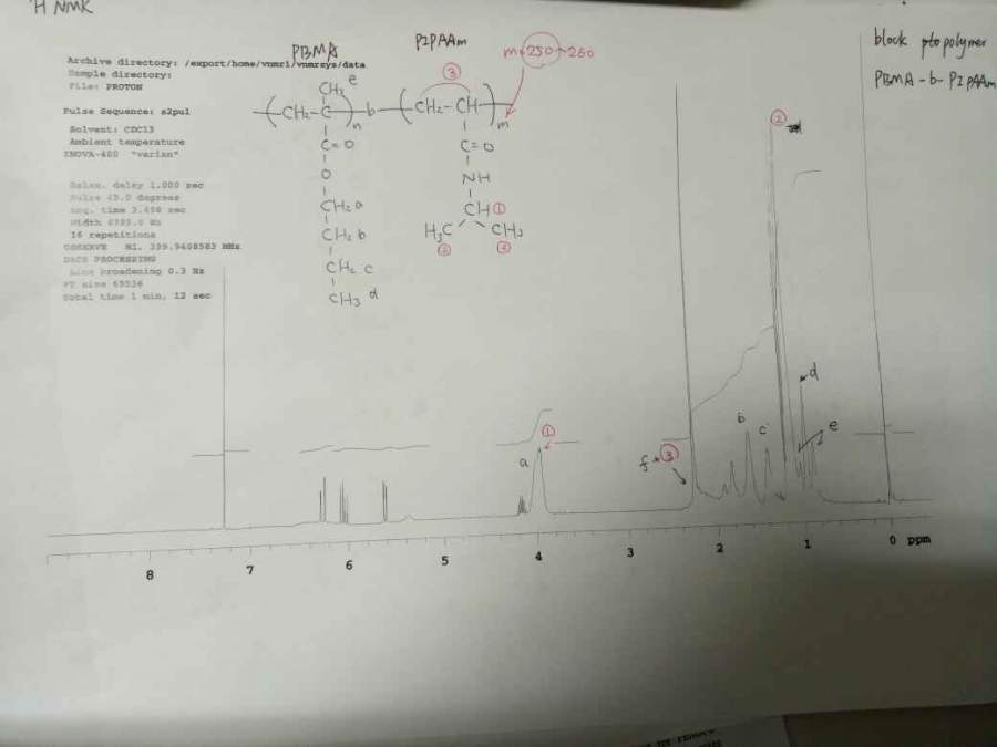 最近给我合成的聚合物做了1HNMR,已经知道分子结构, 图中我已经标出了各个峰,但是我不知道这样怎么得到m和n,可以得到m和n的比例吗,分子量可以得到吗 发自小木虫Android客户端 |