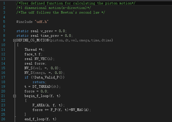 最近在计算一个腔体内的膨胀气体推动活塞做功的算例,气体压力随着活塞运动而改变,所以要写一个边界运动的udf,写好后通过fluent interpret后在line 7发生了错误(parse error) ,想请大牛们指导指导。代码和错误如图。1.png 2.png 3.png |