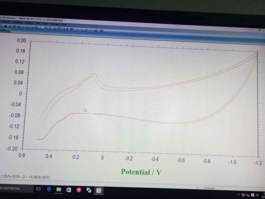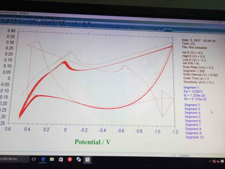 新手请教,我测试出来的数据在 0.1V附近有一个峰,不明白是什么?_?,另外测试电压范围是我自己试出来的,但是其实在扫描电压速率低(5mV/s)的时候,在-1.8到+0.8的范围都可以,在扫描电压速率高(0.5V/s)的时候估计就0.5V到1.2V比较合适,没有合适的文献参考,想咨询一下这个电压范围一般怎么定啊?是要正负极的电流峰值对称吗?另外多次循环为什么会出现一些乱的线条啊,怎么处理掉啊?新手金币比较少,谢谢啦! 发自小木虫Android客户端 |