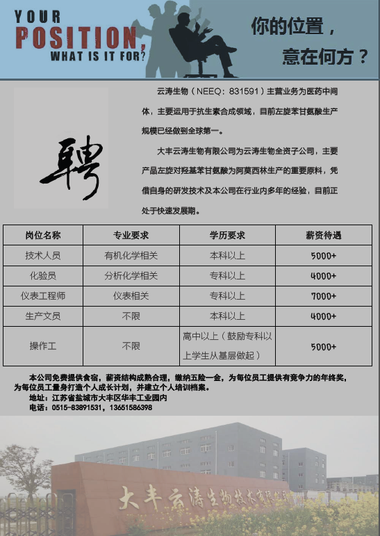 大丰云涛生物技术有限公司是浙江云涛生物技术股份有限公司下设子公司。 浙江云涛生物技术股份有限公司主营业务为医药中间体的研发、生产和销售,主要应用于抗生素合成领域,上游供应商为基础化工企业和精细化工企业,下游客户为原料药销售和制造企业。公司自设立以来,浙江云涛生物技术股份有限公司一直致力于苯甘氨酸系列产品的研发、生产和销售,经过多年的发展已与行业内各知名药企建立了稳定的供应关系。大丰云涛生物技术有限公司致力于对羟基苯甘氨酸系列产品的研发、生产和销售,凭借自身的研发技术与本公司行业内多年的经验积累,大丰云涛生物技术有限公司目前正处于快速上升期。 现面向社会招聘环保负责人(要求懂污水生化处理,交际能力佳)、技术员(有机化学基础知识扎实,有合成经验)、QC(有化学分析经验)、操作工。待遇面议。 有意向者发送个人简历至lwk@yuntaochem.com [ 来自版块群 江苏 ] |