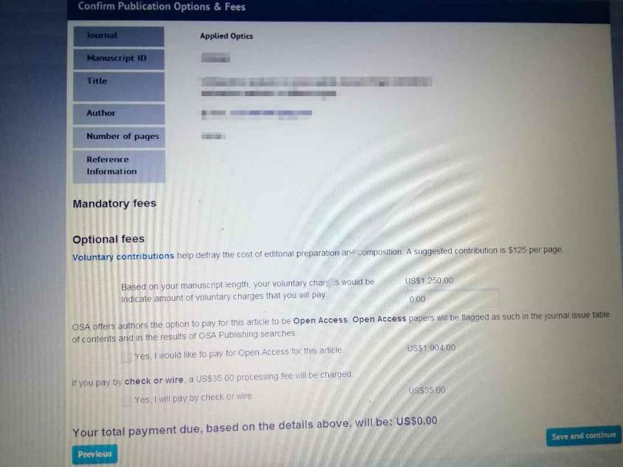 如题,我8月24号论文的状态变成了production的,然后9月5号接到了proof通知,并且已经回复需要改动的地方了,然后很快就接到了邮件说系统里有一个publication charge的蓝色按钮,我点进去之后选择不交稿费,按save and continued按钮之后,又返回到了原来系统的界面上,然后那个publication charge的按钮还是存在,而且还能点开,关于订购我没理会,也没点进去操作,到现在状态还是production,请问有经验的大家这是怎么回事,是我关于交费的步骤没办好还是怎么回事呢(补充一句,proof上显示的期刊号是今年12月份发表) 发自小木虫Android客户端 |