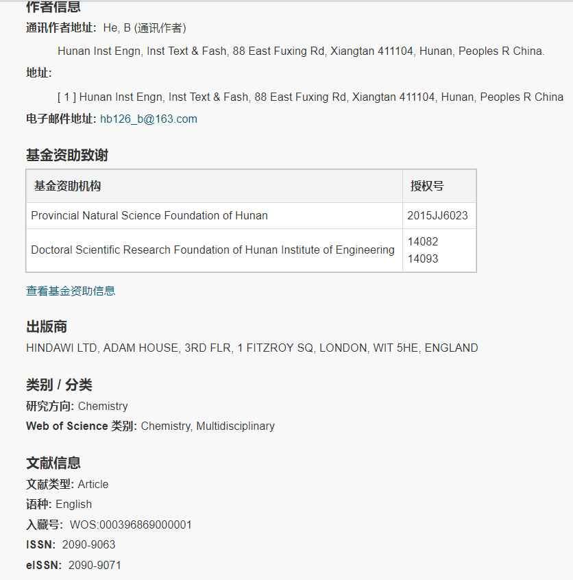 题目:Study on the Preparation and Anisotropic Distribution of Mechanical Properties of Well-Aligned PMIA Nanofiber Mats Reinforced Composites 期刊:Journal of Chemistry 卷期:2017 , 2017 , 2017 (3) :1-7 是否已经被SCI检索? 谢谢! |