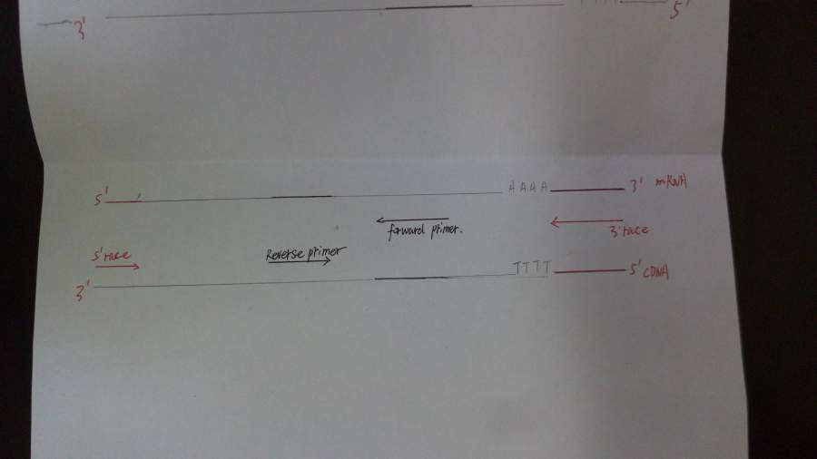 我是根据转录组数据设计的forward 和reverse primer,在race 3‘端时,应该加入反向引物和 3’race 引物?但是有的人说加正向引物和3‘race引物,请大家看图。再问一下,转录组最后给的是cDNA序列吧? 123.jpg |