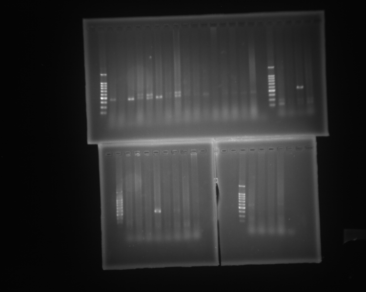鼠尾genotyping,PCR后跑胶,因为中途有事,在EB里泡了40分钟,然后照胶,发现: 1.100bp的maker跑不出来,绝对没有跑出去 2.每个泳道的背景都很强 3.百分之百有条带的基因(上面一行样品在500bp左右应该有条带)没有看到明显的条带 4.每个泳道前沿都有一团白色 以前只在EB里泡20-30分钟,虽然100bp的maker经常跑不出来,但不至于阳性条带不出现,也不会有一团白色,背景也比较低。难道真的是EB泡的时间过长? 请帮我分析一下什么原因,谢谢。注:maker是100bpDNA ladder,2%agarose. ![]() ![]() ![]() |