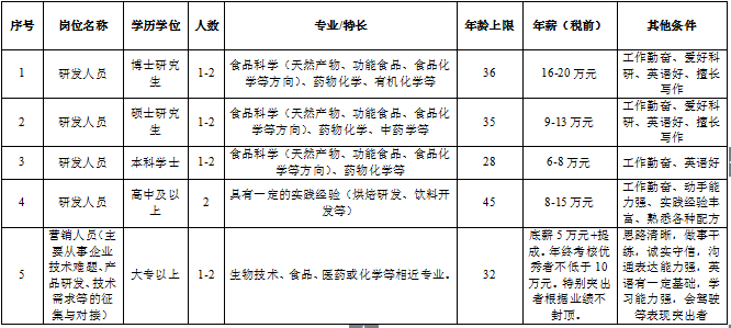 金华食品产业化研究院坐落于风景秀丽的国家级历史文化名城、中国十佳宜居城市之一的浙江省金华市,是一家于2017年6月成立的国有的企业化专门研究院,由金华市政府、金华市婺城区政府与大学共建。研究院位于浙江省金华市北部,G60高速金华出口处,距离浙江师范大学、金华高铁站均为5分钟车程,高铁到杭州东站50分钟车程,交通十分便利。研究院重点根据金华的食品产业需要,助力企业转型升级,研究开发各类食品,解决食品企业各类技术难题。对于引进的人才享受金华市各类人才政策(购房补贴、入托入学、配偶工作等)。研究院按照高起点、高 层次、重能力、共成长的原则选拔各类研发人才,同等条件下待遇比杭州等大城市高30%,比同城金华待遇高40%。 人员经面试录用后,试用期3个月,工资发放按照录用后的待遇同等发放,签订工作合同。年度工作考核优秀者年薪递增10%,考核合格递增5%。 有意向者请将个人简历(包含:个人基本情况、学习工作经历具体到年月、研究特长、工作技能、奖励荣誉、论文专利等及研究经历经验、工作经验、技能特长等信息)发送至邮箱:jhspyjy@163.com,面试时需提供原件或复印件。 QQ图片20170913142818.png |