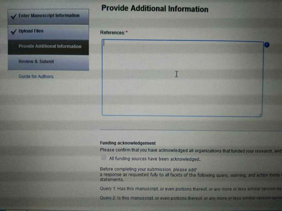 谢谢你的回复!还想请教几个问题,需要标序号吗?比如:[1];另外,我上传的pdf中有参考文献了。它这个参考文献是干啥用的?这个投稿系统要上传CoverLetter吗? 发自小木虫Android客户端 |