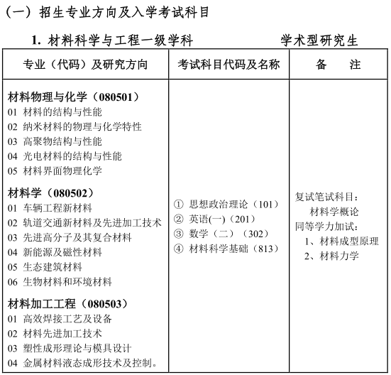一、材料类专业研究生招生概况 兰州交通大学材料类专业依托本校机电工程学院及材料工程系办学。拥有“轨道交通装备材料与应用工程(0802Z5)”、“车辆工程(080204)”二级学科博士学位、硕士学位和“材料科学与工程”一级学科硕士学位授予权。“材料科学与工程”学科是甘肃省重点学科,具有材料物理与化学(080501)、材料学(080502)和材料加工工程(080503)3个二级学科学术型硕士研究生和“材料工程”专业学位(085204)工程硕士培养资格。 培养的研究生主要在轨道交通、装备制造、冶金、化工、工程建设等领域从事产品生产、材料制备及工艺设计、材料改性、新材料开发、材料分析检验、材料成型设备开发等工作,或在高校从事教学和科学研究工作。 学校为研究生提供国家助学金、国家奖学金、学业奖学金、“交大之星”奖学金、企业奖学金等各种奖助措施。对于全日制二本及以上院校本科毕业、第一志愿录取的考生发放研究生一年级学业奖学金,奖金额度4000-8000元不等。 二、研究生招生专业及入学考试 (二)考试参考书目: 1.材料科学基础:《材料科学基础》,王顺花主编,西南交通大学出版社. 2.材料学概论:《材料科学概论》,许并社主编,北京工业大学出版社. 三、研究生指导队伍 材料学科现有研究生指导教师13名,其中博导1名,硕导12名。教授5人(冯利邦,王彦平,徐卫军,王顺花,耿中荣),副教授10人(郑韶先,王新伟,徐立新,强小虎,黄大建,褚克,张媛,刘艳花,孟倩,赵锡龙)。研究生指导教师的具体信息参见: https://jdxy.lzjtu.edu.cn/xygk/szdw.htm。 四、联系方式 电话:兰州交通大学研究生院招生办公室,0931-4938103 兰州交通大学机电工程学院研究生招生办,0931-4955702 兰州交通大学材料系,0931-4956651 网址:兰州交通大学主页https://www.lzjtu.cn/ 兰州交通大学机电工程学院https://jdxy.lzjtu.edu.cn |