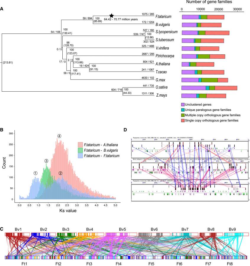 Tartary buckwheat (Fagopyrum tataricum) is an important pseudocereal crop that is strongly adapted to growth in adverse environments. Its gluten-free grain contains complete proteins with a well-balanced composition of essential amino acids and is a rich source of beneficial phytochemicals that provide significant health benefits. Here, we report a high-quality, chromosome-scale Tartary buckwheat genome sequence of 489.3 Mb that is assembled by combining whole-genome shotgun sequencing of both Illumina short reads and single-molecule real-time long reads, sequence tags of a large DNA insert fosmid library, Hi-C sequencing data, and BioNano genome maps. We annotated 33 366 high-confidence protein-coding genes based on expression evidence. Comparisons of the intra-genome with the sugar beet genome revealed an independent whole-genome duplication that occurred in the buckwheat lineage after they diverged from the common ancestor, which was not shared with rosids or asterids. The reference genome facilitated the identification of many new genes predicted to be involved in rutin biosynthesis and regulation, aluminum stress resistance, and in drought and cold stress responses. Our data suggest that Tartary buckwheat's ability to tolerate high levels of abiotic stress is attributed to the expansion of several gene families involved in signal transduction, gene regulation, and membrane transport. The availability of these genomic resources will facilitate the discovery of agronomically and nutritionally important genes and genetic improvement of Tartary buckwheat. |