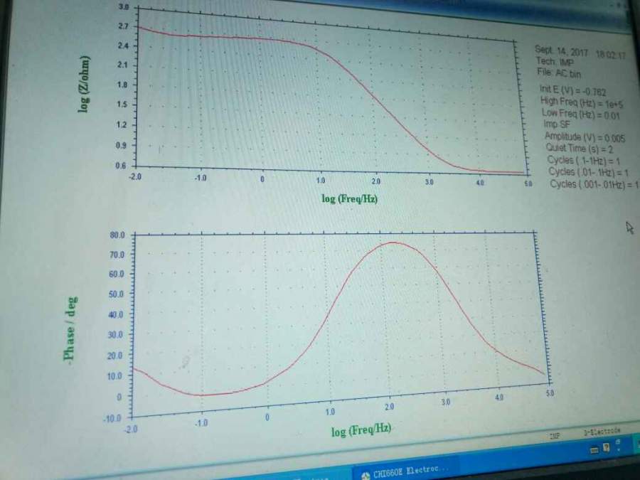 第一张是nyqust图,您描述的这个情况在腐蚀里见到过,曹先生的腐蚀阻抗谱有提到;第二张应该是bode图,你所谓的阻抗值小于零没理解,抱歉! 发自小木虫IOS客户端 |