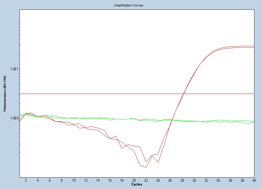 图一:使用本试剂盒提取弥漫性大B细胞淋巴瘤石蜡包埋组织(5 μm, 6 片)DNA,再以人GAPDH为目的基因进行qPCR;同时,用纯水作为阴性对照。结果显示,DNA的PCR基因扩增良好,而纯水无PCR扩增;表明本试剂盒所提取的DNA质量好,可直接运用于下游PCR等后续实验。