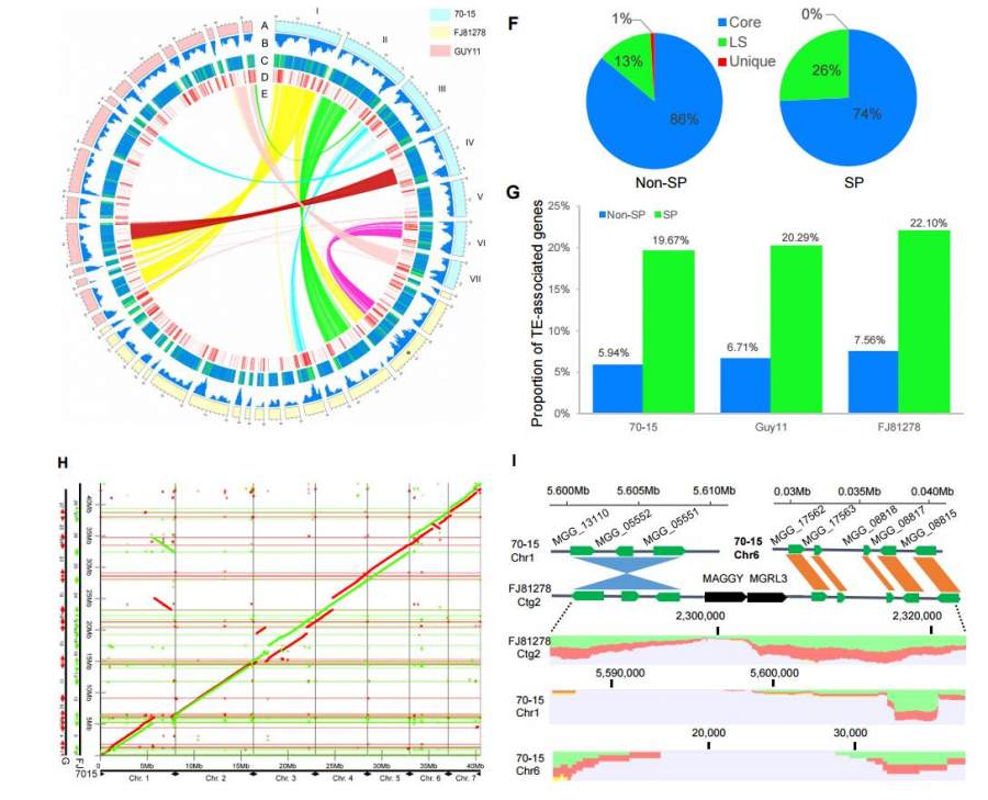 水稻作为世界一半以上人口的主要粮食作物正受到稻瘟病的严重影响。稻瘟病菌(Magnaporthe oryzae或Pyricularia oryzae)引起的稻瘟病造成水稻巨大的产量损失(Dean等2012;Deng等2017;Nalley等2016)。这种丝状子囊菌也能感染其他重要的谷类作物从而导致瘟病,如小麦、小米、高粱、黑麦和玉米等,因此稻瘟病菌为世界上最重要的植物病原真菌(Zhong等2016)。全基因组测序技术的出现以及高通量测序(NGS)策略的后续应用已成功地为超过50个稻瘟病菌分离株做了基因组组装。新技术的应用扩展了研究人员对稻瘟病菌如何进行宿主适应、寄主专一性以及宿主范围扩大来克服宿主抗性方面的认识(Dean等2005;Wu等2015;Xue等2012;Zhang等2016)。然而,基于NGS组装的基因组进行的比较基因组研究结果未呈现出稻瘟病菌基因组特征的深度信息,此对于稻瘟病菌普遍的基因组变异有关,因为NGS组装是高度分散的并且缺乏大部分谱系特异性(LS)区域,LS区域比核心基因组更具可塑性,而且富含重复和效应蛋白(Faino等,2016;Raffaele和Kamoun,2012)。 稻瘟病菌是世界危害最大的植物病原真菌之一,它引起的稻瘟病严重威胁着水稻等谷类作物的安全生产。基因组测序是解析稻瘟病菌的宿主跃迁和毒性变异机制的关键,陆续已经有近70个菌株基因组被测序,但这些基因组都是有大量空缺的草图,制约了稻瘟病菌比较基因组和功能基因组学的研究。 稻瘟病菌是一种半活体寄生丝状子囊真菌,它引起的稻瘟病每年导致水稻减产10%~30%,最近发现它还能侵染小麦,导致南美地区麦瘟大流行,并已扩散到南亚的孟加拉国等地,严重威胁世界粮食生产安全。稻瘟病菌以毒性变异迅速著称,为了解析它的致病机理和毒性变异机制,陆续已经在NCBI基因组数据库登录了66个菌株基因组。但是,目前的参考基因组混杂有草瘟背景,而其他二代测序基因组都是高度片段化的草图,且缺乏完整转座子等重复序列信息,不是理想的参考基因组。 为解决这个问题,该研究团队利用福建农林大学基因组中心PacBio单分子实时测序平台,完成了稻瘟病菌菌株FJ81278(来自福建)和Guy11(来自法属圭亚那)的基因组组装。PacBio测序显着提高了基因组质量,总基因组大小比参考基因组70-15增大了约10%,主要是重复序列,并填补了参考基因组约70%的空隙。与Illunima测序基因组相比,PacBio测序基因组的N50增加了约20倍,重叠群(Contig)数量减少了约95%。群体基因组分析显示分泌蛋白富集在谱系特异区(lineage-specific regions)而不是菌株特异区(isolatespecific regions),而谱系特异区富含重复序列,进一步全基因组水平关联分析显示转座子关联的分泌蛋白水平显著高于非分泌蛋白,其中Pot2是插入分泌蛋白附近频率最高的转座子而Pot3是分泌蛋白与非分泌蛋白差异显著的转座子。此外,染色体重组位点附近也是转座子富集区因此,转座子是稻瘟菌基因组和毒性变异的主要驱动力。 越来越多的实验表明,转座子(TE)在驱动许多植物致病真菌的基因组可塑性和致病性变异方面起着重要作用(Faino等2016;Raffaele和Kamoun,2012)。然而,TE促进稻瘟病菌毒力进化的全基因组水平影响的研究较少,主要因为目前Sanger介导的参考基因组是来自实验室菌株70-15,它来源于水稻分离株Guy11和弯叶画眉草(Eragrostis curvula)分离株的杂交。TE的组成和分布可能与水稻感染分离株的组成和分布有很大的差异,可能不能说明TE对基因组范围内稻瘟病菌田间分离株毒力进化的影响。此外,利用NGS平台产生的其他天然存在的稻瘟病菌田间分离株的基因组装因短测序片段不能确定TE的全长。 为解决这些局限性,研究人员应用由Pacific BioSciences(PacBio)开发的单分子实时(SMRT)测序技术,为稻瘟病菌分离株FJ81278和Guy11组装近乎完整的基因组,并评估了TE对基因组变异的可能影响,如染色体易位、LS区域的基因存在或不存在以及与毒力相关的分泌蛋白(SP)的多态性。 |