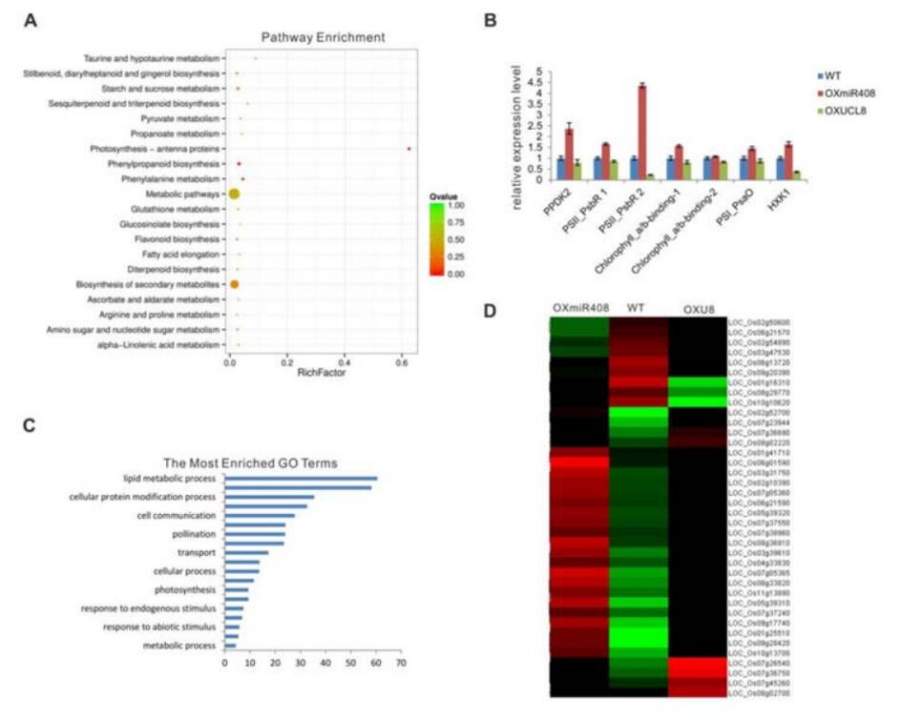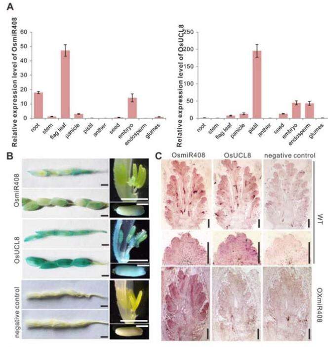 该研究通过系统的形态学和细胞学观察结合分子生物学手段,揭示了miR408靶向蓝铜蛋白编码基因OsUCL8可以影响叶绿体内铜离子稳态,进而导致水稻光合速率增强、产量增高。 中山大学陈月琴教授团队于2013年发现并报道了第一例正向调节水稻产量的miRNA--miR397(Nature Biotechnology, 2013)。在此基础上,通过miRNA表达模式和靶基因功能分析,筛选获得第二例正调控水稻产量的miRNA分子--miR408。MiR408通过调控蓝铜蛋白编码基因OsUCL8影响植株的光合作用效率以及产量性状等。 铜是生物体不可或缺的金属元素之一,由其参与构成的铜蛋白广泛存在于动物、植物和微生物中。铜蛋白具有多种生理功能,包括载氧、铜库贮存、电子传递和氧化还原等。在植物蓝铜蛋白中最为著名的当数光合电子传递链上的质体蓝素(plastocyanin)。在该研究中,研究者发现miR408过表达可以导致水稻产量增高,而其靶基因OsUCL8的CRISPR敲除或RNAi敲低植株也表现出与miR408过表达相一致的表型。研究表明,细胞质定位的蓝铜蛋白OsUCL8会影响植物细胞总铜含量和叶绿体铜库,导致叶绿体内质体蓝素的稳定性发生变化,进而改变植株的光合作用效率以及株型、穗型、粒型等产量性状。 Increasing grain yield is the most important subject of crop breeding. Here, we report the elevated expression of a conserved microRNA, OsmiR408, could positively regulate grain yield in rice by increasing panicle branches and grain number. We further showed that OsmiR408 regulates grain yield by downregulating its downstream target, OsUCL8, which is an uclacyanin (UCL) gene of the phytocyanin family. The knock down or knock out of OsUCL8 also increases grain yield, while the overexpression of OsUCL8 results in an opposite phenotype. Spatial and temporal expression analyses showed that OsUCL8 was highly expressed in pistils, young panicles, developing seeds and inflorescence meristem, and was nearly complementary to that of OsmiR408. Interestingly, the OsUCL8 protein was localized to the cytoplasm, distinctive from a majority of phytocyanins which localize to the plasma membrane. Further studies revealed that the cleavage of OsUCL8 by miR408 affects copper homeostasis in the plant cell, which in turn affects the abundance of plastocyanin proteins and photosynthesis in rice. This is the first report of the effects of miR408-OsUCL8 in regulating rice photosynthesis and grain yield. Our study further broadens the perspective of miRNAs and UCLs and provides important information for breeding high-yielded crops through genetic engineering. |