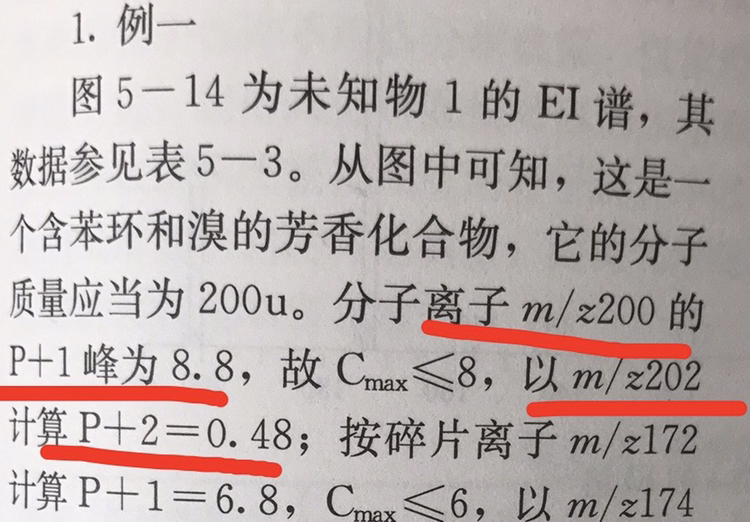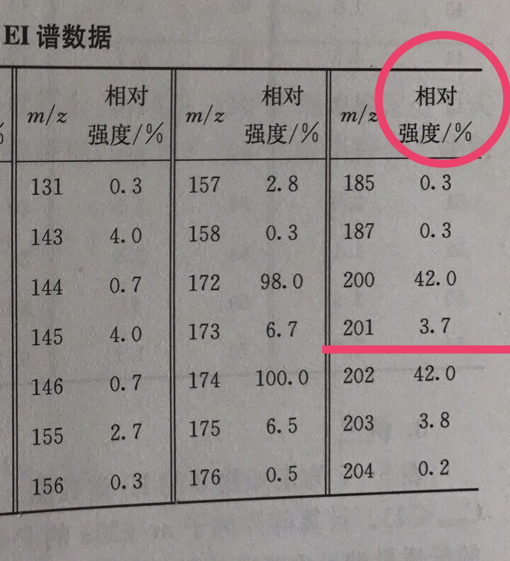 它的分子质量应当为200u。分子离子m/z200的p+1峰为8.8(p+1是指比分子离子峰大一个质量的离子强度值称为p+1。)但是下表所列:201的相对强度为3.7,为什么成8.8了呢? 发自小木虫IOS客户端 |