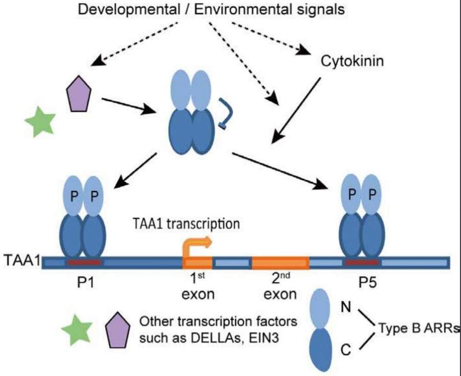 该研究证明细胞分裂素B类ARRs在激素,环境以及发育信号对TAA1的转录调控中扮演着核心的角色。 TAA1(拟南芥色氨酸氨基转移酶1)催化由色氨酸形成吲哚3丙酮酸的反应。该反应是IPA所依赖的生长素合成通路中的第一步。TAA1的表达呈组织特异性,其表达受发育信号、植物激素和外界环境因子的调控,但是其调控机制目前并不清楚。本研究对TAA1的转录调控机制进行了探索,发现TAA1启动子和第二个内含子中包含两个调控TAA1组织特异性的表达所必须的顺式调控元件。部分细胞分裂素B类ARRs(Arabidopsis Response Regulators)的C末端(如ARR1C)可以直接特异性地结合到上述顺式调控元件,并激活其下游报告基因的表达。B类ARRs是细胞分裂素信号转导途径中的重要组分。进一步研究则表明B类ARRs不仅介导了细胞分裂素对于TAA1的转录调控中,也参与到了乙烯和光信号对TAA1的表达调控。介导赤霉素和乙烯信号转导的DELLA和EIN3-GFP转录因子可直接与ARR1C相互作用并促进ARR1C的转录活性。由此,我们提出细胞分裂素B类ARRs是TAA1转录调控的核心组分,整合了激素,环境以及发育信号对TAA1的调控。 A proposed model showing that the type B ARRs function as central transcriptional regulators of TAA1. 生长素是调控植物生长发育的重要植物激素。在调控植物胚胎发育、器官形成以及植物的向性反应等生理过程中,生长素通过建立合适的浓度梯度行使其功能,而这种浓度梯度的建立则依赖于植物对生长素合成与代谢以及转运过程的有序调节来实现的。许多生长素合成基因的表达均存在组织特异性,并且受到外界环境信号的调节。我们的研究拓展了我们有关植物生长素合成基因的调控机制的认识。 During embryogenesis and organ formation, establishing proper gradient is critical for auxin function, which is achieved through coordinated regulation of both auxin metabolism and transport. Expression of auxin biosynthetic genes is often tissue specific and is regulated by environmental signals. However, the underlying regulatory mechanisms remain elusive. Here, we investigated the transcriptional regulation of a key auxin biosynthetic gene, TAA1 (L-Tryptophan aminotransferase of Arabidopsis 1). A canonical and a novel ARR (Arabidopsis response regulators) binding site were identified in the promoter and the second intron of TAA1, which were required for its tissue specific expression. C-terminals of a subset of the type B ARRs selectively bind to one or both cis-elements and activate the expression of TAA1. We further demonstrated that the ARRs not only mediate the transcriptional regulation of TAA1 by cytokinins, but also mediate its regulation by ethylene, light and developmental signals. Through direct protein-protein interactions,the transcriptional activity of ARR1 is enhanced by ARR12, DELLAs and EIN3. Our study thus revealed the ARR proteins act as key node that mediate the regulation of auxin biosynthesis by various hormonal, environmental and developmental signals through transcriptional regulation of the key auxin biosynthesis gene TAA1. |