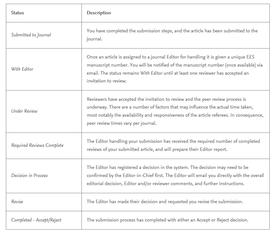 官网链接https://service.elsevier.com/app ... blishing/related/1/ What does the status of my submission mean in EES? (Last updated on 07/09/2017 11.41 AM) If your article is submitted to a journal and going through the editorial process but not yet accepted for publication, you can check its status in EES and more information on the statuses you're likely to see can be found below. If you want to find out more about when to expect a decision from the Editor, click here. Accepted articles are automatically sent to the production department once the Editor has made a final decision of 'Accept'. At this point the status of your article in EES will change to 'Completed' and no further modifications can be made in EES. For some journals, the status may include the decision term e.g. 'Completed - Accept'. You will receive more information via email from the production team regarding the publication process. Once your article is accepted for publication, you can track its status with the track your accepted article tool. If your article is submitted or transferred to EVISE please see What does the status of my submission mean in EVISE How Log in to your journal's submission system. In your 'Author Main Menu' in EES: 1.Click 'Submissions Being Processed' if your article is in the submission phase. 2.Click 'Revisions Being Processed' if your article is in the revisions phase. 3.Look under 'Current Status' to find the status of your submission. Status.png |