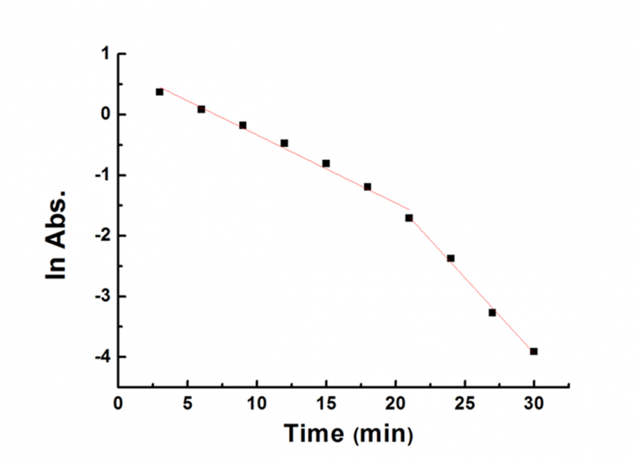 向大家求助! 本人用贵金属催化还原对硝基苯酚,为何会出现两个不同的速率阶段,而且两个阶段的线性都非常好。 请教大家如何解释这种现象。 非常感谢! |