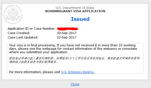 我昨天2017年9月21日约得下午三点北京安家楼大使馆面签,实际窗口是五点左右面签的。一直在排队,人很多。 全程英文对话。签证官开始说的汉语,你好,我回答的英语good afternoon,然后他就英文很快很长的说了第一个问题,我瞬间愣住了,没听懂,大概知道是问我去美国做啥,不敢确定就pardon了一次,他又说了一遍,然后我就回答do some research works,然后又问我研究啥课题,我同样简单回答,又问我去多久,然后又问了有没有小孩。 到最后阶段,签证官说的语速很快,很长,没完全听懂,大概是说给我一个权力手册之类,感觉不重要的例行公事的对话,我没回答,也没敢问是否通过。 当时我拿了递给我的权利小册子还有蓝色的单子,单子上写着恭喜你签证已经通过,上面写着护照领取北京通常三道五个工作日。 最初我给vo护照和2019表,全程对话很简练,过程中只又要了我个人简历。 后来返还了我简历和2019表,并在2019表签字了,只留下了护照, 可刚刚今天下午9.21日一点二十查看。 状态是administrative processing , case created 20-sep-2017, case last updated: 21-sep-2017 这状态应该是正常吧,明后天就会变成issue吧? 因为签证官没有留我任何资料,也没听到任何被check之类的字句。只是过程中重复问了我是否有小孩两次。我爱人全程没有参与任何对话。我说的no,没解释更多。 这个状态不是被所谓check,被审查吧? 有人第二天就issue状态的吗? |
