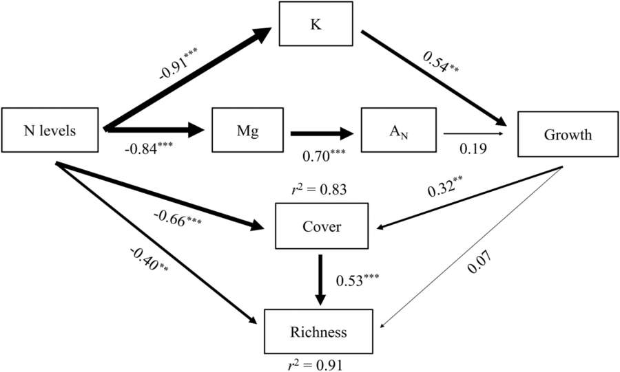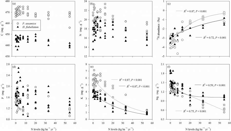 哀牢山山地森林中发达的附生苔藓 苔藓植物因独特的形态结构及生理特性而对大气N沉降非常敏感,被作为大气N沉降的指示生物。目前,关于森林附生苔藓对大气N沉降的响应及其机制,附生苔藓对N污染的临界载荷仍缺少系统、量化的研究,尤其是对亚热带山地森林生态系统而言,尚无相关的研究报道。 附生苔藓组织中C、N、P、K、Mg和15N丰度对不同浓度N添加的响应 中国科学院西双版纳热带植物园恢复生态研究组博士研究生石贤萌在副研究员宋亮和研究员刘文耀的指导下,在云南哀牢山中山湿性常绿阔叶林中进行了为期2年的原位N沉降模拟实验,从多个尺度研究了树干附生苔藓(群落、生理及组织养分含量等指标)对不同N添加水平的响应曲线、生理机制,并估算了附生苔藓植物对N污染的临界载荷,其研究结果表明:1)超过一定浓度的N沉降(> 7.4 ha–1 yr–1)造成了附生苔藓群落盖度和物种丰富度的显著下降;2)过量N供给导致K, Mg等离子流失和叶绿素降解,引起附生苔藓植物碳(C)代谢的失衡,抑制苔藓植物的光合速率和生长,并对附生苔藓造成直接的毒害,从而影响到山地森林生态系统物种组成、多样性与分布;3)通过分析与比较,构建了亚热带山地森林附生苔藓植物响应N沉降的生理生态机制模型,并估算出该区森林附生苔藓植物对N沉降的临界载荷为18 kg ha–1 yr–1;4)过多N添加造成森林附生苔藓植物的盖度及生物量下降,在一定程度上暗示了山地森林冠层附生植物群落中C、N等元素向林下地表转移的趋向。 N添加影响附生苔藓多样性丧失的结构方程模型示意图 本研究首次系统阐明了N沉降对亚热带山地森林附生苔藓的影响,该研究结果为深入研究山地森林附生苔藓植物对大气N沉降的响应及其机理,探讨应用苔藓植物作为大气N沉降指示生物的方法和技术,以及亚热带山地森林生态系统生物多样性的保护与管理提供了科学依据。 Study site and the experimental design. Increasing trends of atmospheric nitrogen (N) deposition due to pollution and land-use changes are dramatically altering global biogeochemical cycles. Bryophytes, which are extremely vulnerable to N deposition, often play essential roles in these cycles by contributing to large nutrient pools in boreal and montane forest ecosystems. To interpret the sensitivity of epiphytic bryophytes for N deposition and to determine their critical load (CL) in a subtropical montane cloud forest, community-level, physiological and chemical responses of epiphytic bryophytes were tested in a 2-year field experiment of N additions. The results showed a significant decrease in the cover of the bryophyte communities at an N addition level of 7.4 kg ha−1 yr−1, which is consistent with declines in the biomass production, vitality, and net photosynthetic rate responses of two dominant bryophyte species. Given the background N deposition rate of 10.5 kg ha−1yr−1 for the study site, a CL of N deposition is therefore estimated as ca. 18 kg N ha−1 yr−1. A disordered cellular carbon (C) metabolism, including photosynthesis inhibition and ensuing chlorophyll degradation, due to the leakage of magnesium and potassium and corresponding downstream effects, along with direct toxic effects of excessive N additions is suggested as the main mechanism driving the decline of epiphytic bryophytes. Our results confirmed the process of C metabolism and the chemical stability of epiphytic bryophytes are strongly influenced by N addition levels; when coupled to the strong correlations found with the loss of bryophytes, this study provides important and timely evidence on the response mechanisms of bryophytes in an increasingly N-polluted world. In addition, this study underlines a general decline in community heterogeneity and biomass production of epiphytic bryophytes induced by increasing N deposition. |