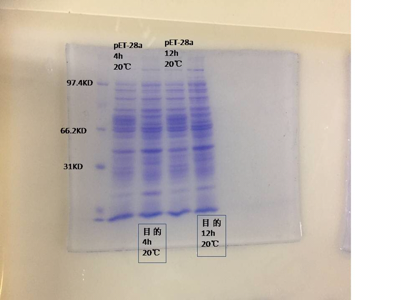 图片第一条marker 前两条是1mM IPTG 后两条是0.6mM IPTG诱导。pET-28a是我的载体 目的蛋白77KD。就是诱导不出来,之前也用37摄氏度试过也不行 。我都急死了。拜托大虾帮我看看 十分感谢