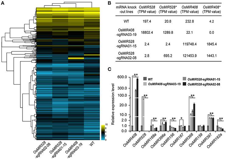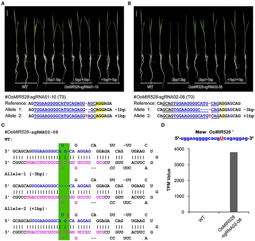 Targeting rice endogenous microRNA genes with CRISPR-Cas9. 研究论文,对CRISPR-Cas9核酸酶在植物microRNA编码基因定向编辑高效实现、突变体准确鉴定、不同基因型编辑事件、遗传表型等关键问题进行了有效解读,为植物microRNA编码基因定向编辑提供了基础数据。 microRNA是一类普遍存在于真核生物中,长度约为19-24个核苷酸的非编码内源小分子RNA。植物microRNA主要分布在基因间隔区和内含子区,由RNA聚合酶II转录生成初级转录本microRNA(pri-miRNA),并经多步加工获得成熟microRNA分子,降解或翻译抑制对应靶基因mRNA,在植物生长发育、表观遗传、应对生物及非生物胁迫等方面起着重要作用。然而,microRNA相关研究工作中,基于RNAi的knock-down策略并不可行,而T-DNA插入突变体也十分有限,很大程度上限制了microRNA具体生物功能的研究。 近年来基于基因组编辑的植物目标基因定向敲除突变体创制工作已取得有效进展,但相对于广泛报道的蛋白编码基因,植物microRNA编码基因却因其功能单元长度有限(成熟microRNA长度主要为19-24bp)、编码区域内存在反向重复相似序列、相关microRNA存在高相似度冗余成员等序列、结构、数目上的复杂性,使得针对microRNA编码基因进行活性定向编辑核酸酶设计、活性评价、编辑事件检出及获得都存在一定困难。其特殊的的基因组结构特性,定向编辑工作开展相对有限。 近年来,电子科技大学植物基因组工程实验室聚焦植物基因组定向编辑开展了有效工作,基于前期开发的高效CRISPR-Cas9系统(Lowder et al., 2015, Plant Physiology; Tang et al., 2016, Molecular Plant)及SSCP定向编辑检测技术(Zheng et al., 2016, Plant Cell Reports),针对水稻microRNA编码基因(包括含高相似度冗余成员的microRNA家族)有效实现了定向编辑突变体材料创制、筛选、鉴定工作: 1、针对对水稻中OsMIR408、OsMIR528编码基因核心功能区实现了有效定向编辑,获得了修饰位点稳定遗传的传代材料(T0代定向敲除效率为48%-89%),明确了其表型及基因型关联关系。同时,高效CRISPR-Cas9配合高灵敏SSCP筛选的策略同样适于具有冗余家族成员的microRNA编码基因OsMIR815a/b/c、OsMIR820a/b/c基因家族不同成员的定向编辑,可有效创制microRNA家族冗余成员多基因聚合定向编辑材料。 SSCP is superior to RFLP on genotyping mutations at microRNA loci. a, RFLP (upper panel) and SSCP (lower panel) analysis of 10 independent OsMIR528-sgRNA02 T0 lines. Note PCR products were digested by SphI in the RFLP analysis. b, Sanger sequencing of the target site in the OsMIR528-sgRNA02 T0 lines. c, SSCP analysis of 6 independent OsMIR528-sgRNA01 T0 lines. Note 3 independent leaves of each T0 plant were genotyped. d, Sanger Sequencing of the target site in the OsMIR528-sgRNA01 T0 lines. 2、通过目标microRNA定向敲除材料基因型及表型关联分析,发现成熟microRNA区间的1-2bp缺失/插入突变并不影响其生物功能表现,只有发生3bp及以上DNA缺失(或插入)突变时,目标microRNA生物功能才受到明显影响。针对OsMIR528位点缺失突变体,进行microRNA-seq高通量分析,发现1bp插入突变基因组位点通过加工获得了一个有别于野生型的新OsMIR528成熟小RNA分子,可以行使与野生型microRNA分子类似的功能,为相关microRNA定向编辑及功能研究工作提供了有效借鉴。 Generation of functionally redundant new microRNAs with genome editing. a, 1-bp indels in mature OsMIR528 don’t abolish miRNA function. b, 3-bp deletion in mature OsMIR528 abolishes function. c, Illustration of pri-MIR528 produced in OsMIR528-sgRNA02-08 mutant lines. Mutagenized target regions are highlighted in green shade. d, Detection of a new microRNA, OsMIR528’, in the 1-bp insertion mutant line by RNA-seq. TPM, trans per million. 3、进一步针对不同OsMIR408、OsMIR528定向敲除基因型突变体进行microRNA-seq高通量测序,发现突变体microRNA转录组发生了显著变化(对应的mRNA-seq转录组分析也表现类似的变化),在一定程度上揭示了植物microRNA转录组表达的网络调控现象。 Targeted knocking out specific microRNAs results in global expression perturbation of microRNAs and their putative targets. a, targeted knock out of OsMIR408 and OsMIR528 results in global expression and perturbation of microRNAs. b,OsMIR408 and OsMIR528 induce each other as revealed by RNA-seq analysis. c, Knocking out OsMIR408 or OsMIR528 boosts expression of OsMIR397 and OsMIR398 as validated by qRT-PCR analysis. MicroRNAs (miRNAs) are small non-coding RNAs that play important roles in plant development and stress responses. Loss-of-function analysis of miRNA genes has been traditionally challenging due to lack of appropriate knockout tools. In this study, single miRNA genes (OsMIR408 and OsMIR528) and miRNA gene families (miR815a/b/c and miR820a/b/c) in rice were targeted by CRISPR-Cas9. We showed single strand conformation polymorphism (SSCP) is a more reliable method than restriction fragment length polymorphism (RFLP) for identifying CRISPR-Cas9 generated mutants. Frequencies of targeted mutagenesis among regenerated T0 lines ranged from 48 to 89% at all tested miRNA target sites. In the case of miRNA528, three independent guide RNAs (gRNAs) all generated biallelic mutations among confirmed mutant lines. When targeted by two gRNAs, miRNA genes were readily to be deleted at a frequency up to 60% in T0 rice lines. Thus, we demonstrate CRISPR-Cas9 is an effective tool for knocking out plant miRNAs. Single-base pair (bp) insertion/deletion mutations (indels) in mature miRNA regions can lead to the generation of functionally redundant miRNAs. Large deletions at either the mature miRNA or the complementary miRNA* were found to readily abolish miRNA function. Utilizing mutants o