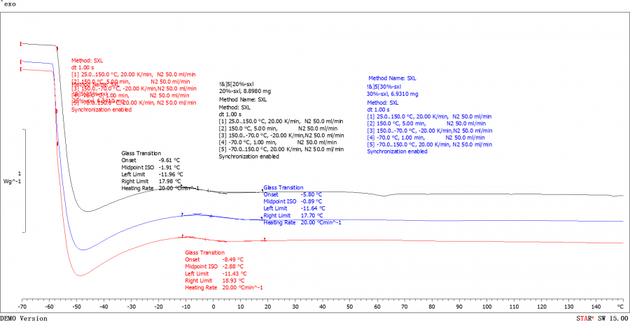 跪求大家帮忙,我的测试条件是以20℃每分钟的速度从室温升到150℃,然后保持5min,20℃每分钟的速度降温至-70℃,然后20℃的速度升温到150℃,得到如图的曲线,求高手帮忙看看-50到-40温度下那个峰是什么峰呀?对材料性能有什么影响? sxl.png |