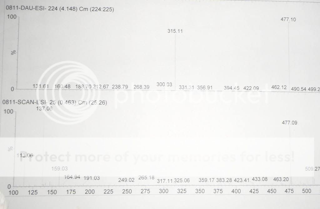 ![]() ![]() ![]() 求高手帮忙解下谱,该物质ESI只能打出[M-H]-,分子量478,紫外吸收峰为249,362nm 万分感谢! [ Last edited by cqpopen on 2009-2-17 at 17:52 ] |