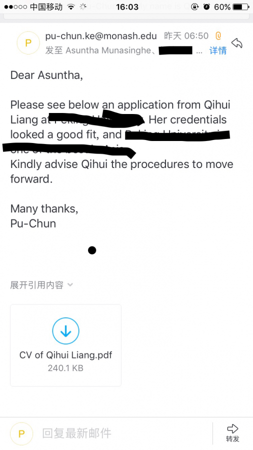 澳洲monash大学 导师将CV转给院里行政老师