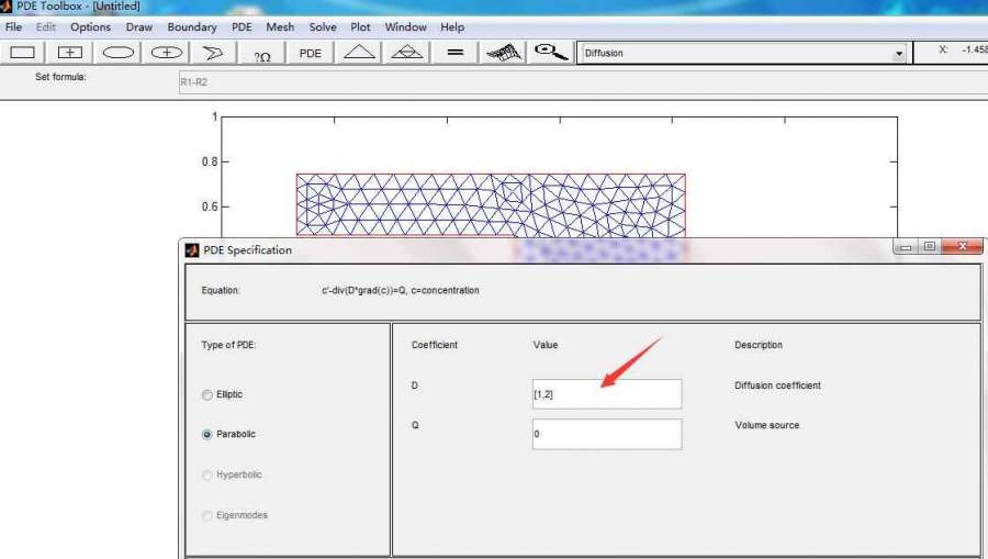 横向与纵向扩散系数不同,设置为D=[Dx,Dy]=[1,2]。但一直提示错误,请大神指点一二! 发自小木虫Android客户端 |