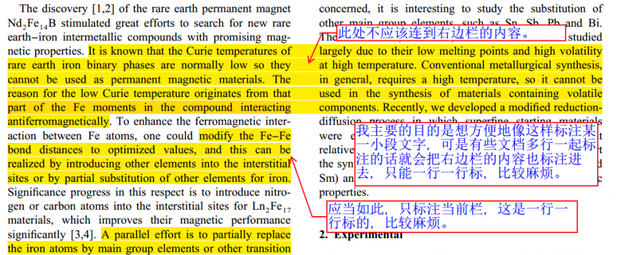 有些分栏的pdf文档进行文本选择时,如果内容为多行,难以选择同一栏内容,却选择了同一行不同栏的内容,如图所示。大部分pdf正常,但是总会碰到有些会有这样的问题,无论使用adobe还是foxit都一样,应该是pdf文档的问题,该怎么解决?是什么原因造成的?希望知... 展开 这里有存在这样问题的一篇pdf文档。http://pan.baidu.com/share/link? ... p;amp;uk=2651721982 我主要的目的是想方便地像这样标注某一小段文字,可是有些文档多行一起标注的话就会把右边栏的内容也标注进去,只能一行一行标,比较麻烦。希望高手解答。 |