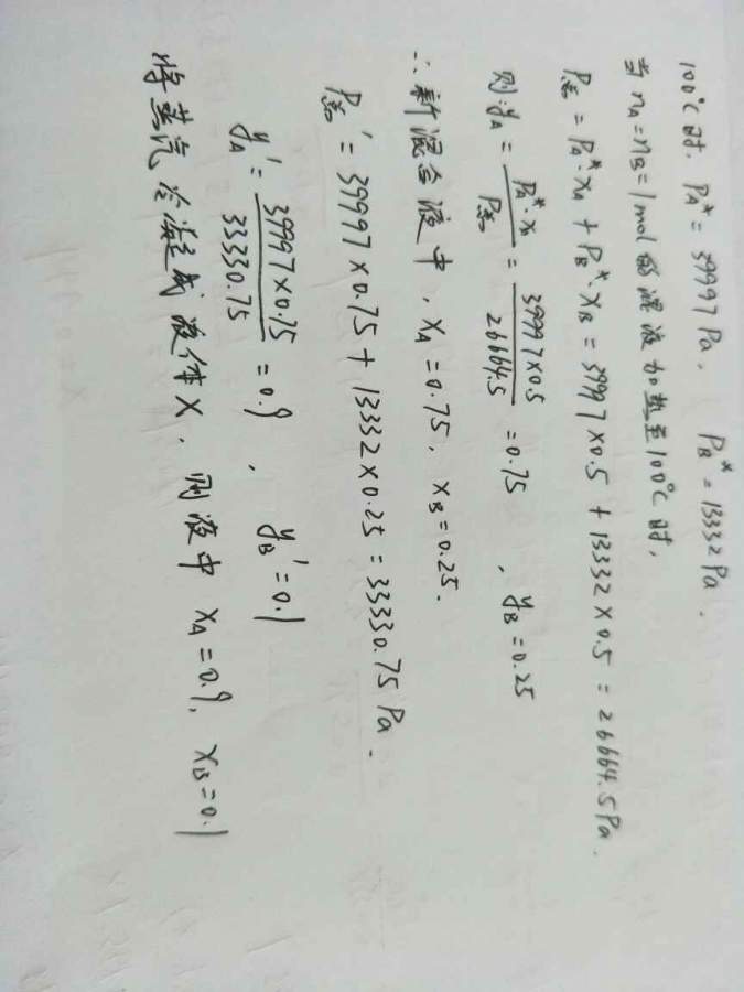 | 液体A和B形成理想溶液。纯A和纯B的蒸汽压(在100℃时)分别为300mmHg和100mmHg。假设100℃时此溶液是由1molA和1molB组成。收集此液体上方的蒸汽,然后冷凝,再把此冷凝液体加热到100℃,然后再使此冷凝液体上方的蒸汽冷凝,形成液体X,问在液体X中,A的摩尔分数为多少? |