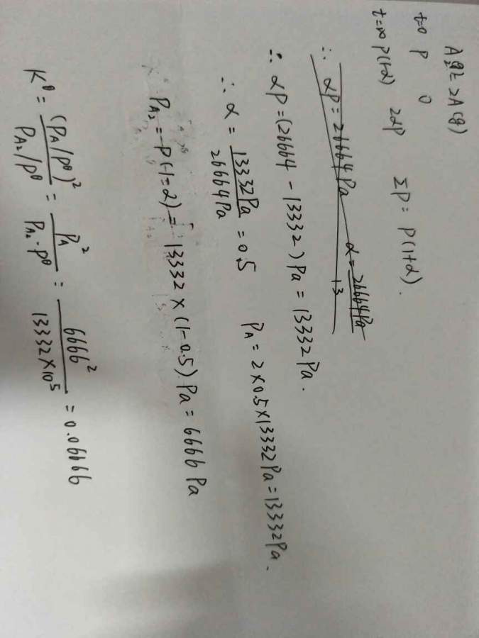 1.将24度(297K)的气体通过理想气体方程将压力转换到127度(400K),这样13332Pa变成17956Pa 2.再根据离解方程计算平衡时A2和A的分压 A2 = 2A 17956 - x 2x (17956-x) + 2x = 26664 x = 8708Pa 17956 - x = 9274Pa = P(A2) 2x = 17416Pa = P(A) 3.计算平衡常数(自己去算吧) |