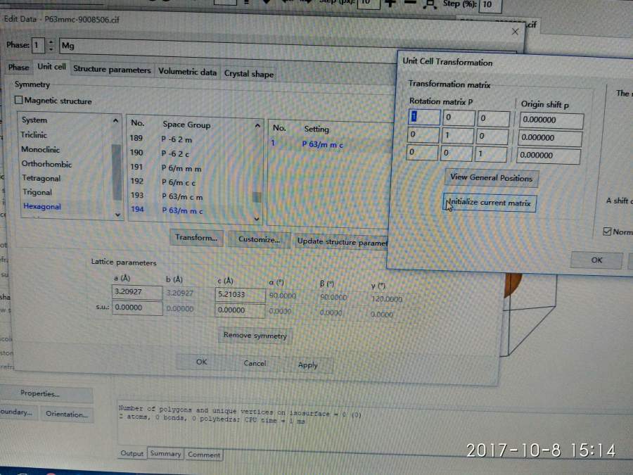 想画6-3-6密排六方的Mg晶体结构,已下载Mg空间群为P 63/m m c的cif文件,如图一,附件1为CIF文件;Mg的坐标为(1/3,2/3,1/4)如图二。 如何用VESTA设置 unit cell---transform...如图三?求大神指点!!! 如会MS绘制,也望不吝赐教! 1.jpg 2.jpg 3.jpg |
