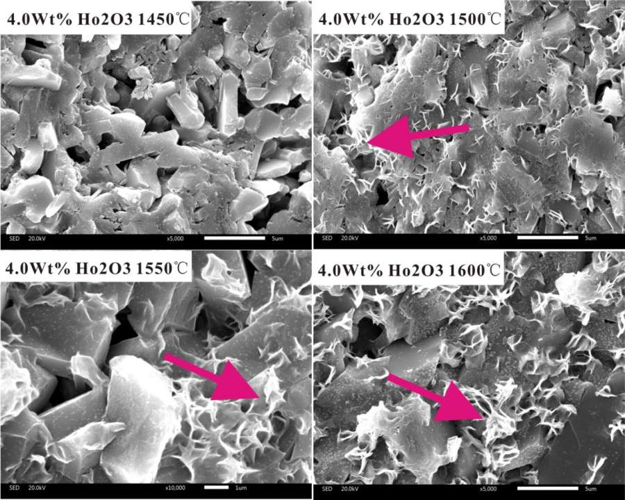 材料为氧化钬-氧化铝-氧化硅,经过烧成之后,出现了花状物质,xrd分析:72wt%氧化铝,16wt%莫来石, 6wt%硅酸钬,6wt%二氧化硅。 花状物质后来又消失,请问,1:花状物质是什么,推测为硅酸钬,2:为什么花状物质一开始没有出现,然后开始出现,最后又消失,其机制是什么?3:最后推荐相关书籍与文献。 小木虫求助 不同烧成温度.jpg |