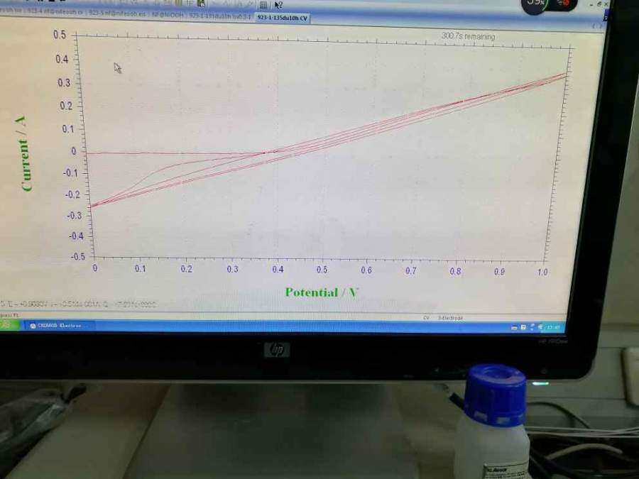 我是做OER的,用的三电极体系,电解质为pH=14的KOH溶液,参比电极为Ag/AgCl,对电极碳棒,工作电极是泡沫镍负载了镍的碱式盐Ni2(NO3)2CO3,(活化后变黑Raman显示转化为氧化镍),扫描范围设置为0-1V,相对于RHE就是1-2V,正常在理论析氧电位1.23V之前不应该有反应,或者有个小的催化剂的氧化峰,可是我的CV在起始点位为1V的时候电流密度为负。 我自己分析1.一个可能是催化剂有电容器性能充放电电流造成负电位,不过不应该这么大啊。 2.有物质在1.23之前可以被还原,查了Ni三价离子氧化性很强(相对于标准氢电极电势1.84)不应该出现……二价镍被还原成单质镍也不对。 3.测别的东西比如NiOOH,空白泡沫镍这种曲线都正常 发自小木虫Android客户端 |