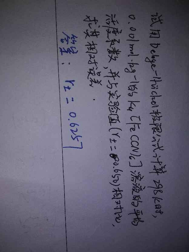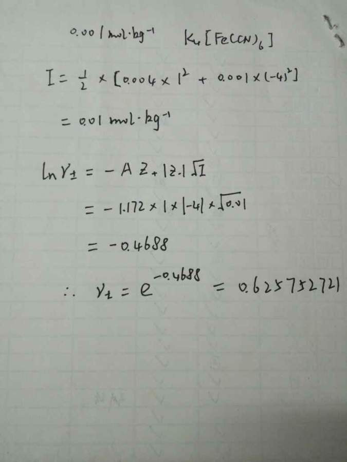 | 0.001mol/kg K4[Fe(CN)6]溶液用德拜-休克尔公式算平均活度时,z+取多少? |