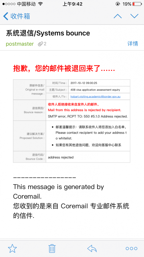 递签已经快三个月了,补材料也过了一个月,一直没下签,前天打电话催签,对方给了一个邮箱,说可以联系到签证官,可是邮件发送不出去,好像对方只接受白名单上的邮件,这种情况该怎么办,就联系不上签证官了吗?就是图中那个邮件地址 发自小木虫IOS客户端 |