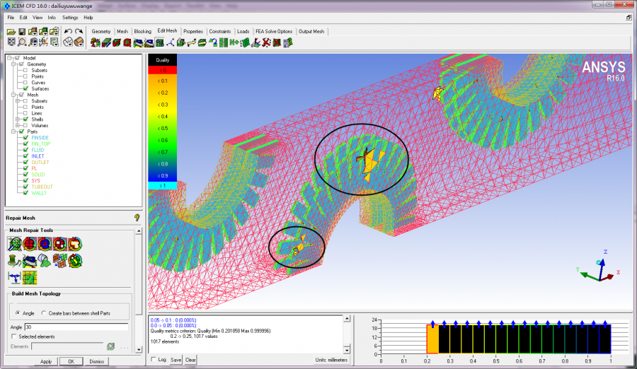 本人画了一个翅片管的网格,在导入fluent后出现浮点错误,查原因可能是网格质量太差,造成的,在ICEM里看了下,网格质量为0.2,想请教各位大神,我可以通过什么有效途径将网格质量提高,开始质量低于0.2,我smooth了一下,达到了0.2,感觉还是不够,图中是黑圈内是网格质量较差的地方,想请教下有没有什么方法把这些地方质量提高(PS:本人萌新一枚,望各路大神指教了) 1、.png |