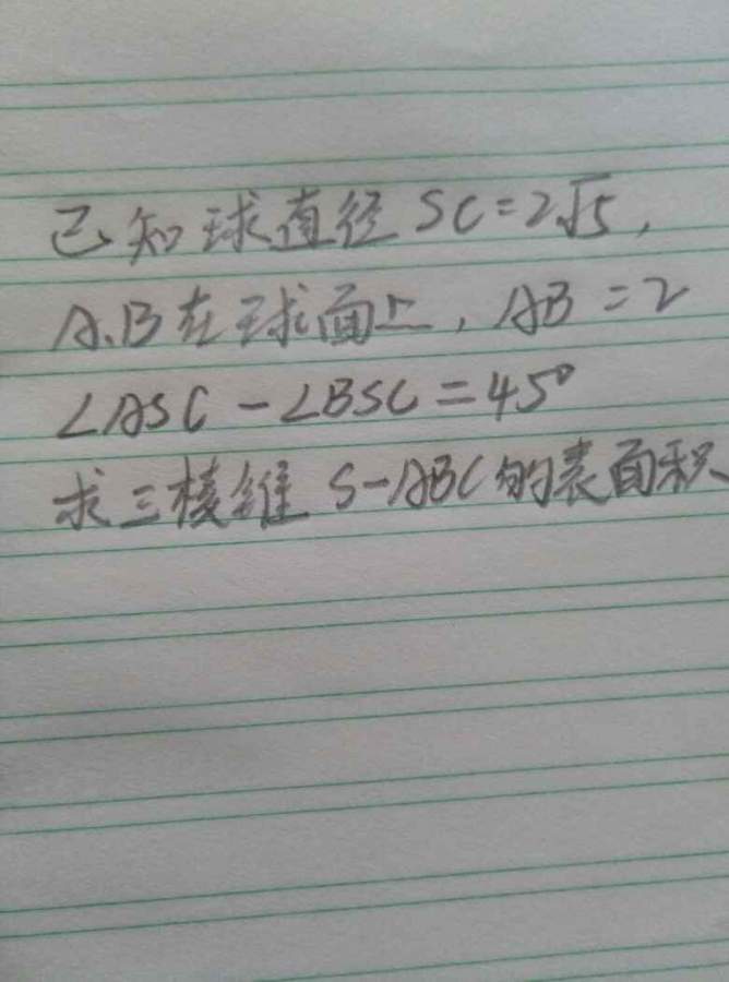 已知球的直径SC=2√5,A,B在球面上,AB=2,角ASC减角BSC等于45度,求锥S-ABC的表面积 (注意题设条件里两角差是45度) 发自小木虫Android客户端 |