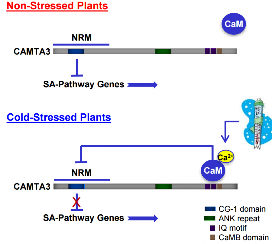 拟南芥钙调素结合转录激活因子CAMTA抑制22°C下健康生长的植株中水杨酸SA生物合成相关基因及SA介导的免疫。这个抑制会被低温处理(4°C)或者活体和半活体营养病原菌侵染所解除。 本文研究显示CAMTA3介导的SA通路基因的抑制涉及到N端抑制单元NRM的表现,NRM起作用独立于钙调素CaM结合到IQ和CaM结合(CaMB)结构域。该发现与现有的推论认为CAMTA3抑制活性需要CaM结合到CaMB结构域上相违背。响应于低温处理的SA通路基因诱发在只表达CAMTA3-NRM区域的植株中并未检测到。 突变分析显示NRM的抑制活性会被响应于低温处理产生的信号的IQ和CaMB结构域所抑制。表达CAMTA3-NRM区域的植株在对病毒性半活体病原菌丁香假单胞菌DC3000的抗性上有所缺陷。本文的研究结果表明低温处理和病原菌侵染调控的CAMTA3抑制活性涉及到一些分子机制,但两者有明显区分。 |