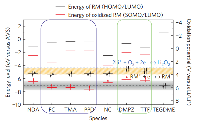 Rational design of redox mediators for advanced Li–O2 batteries文章中电离能是等于HOMO的负值吗?查了一下有人说是的,但文章最后结论给的电离能范围是5.8eV~6.8eV,和文章给的图对不上啊?还有就是为什么要同时考虑RM和RM+的HOMO和LUMO?新人求助!!!! (I{QYQ$K@TKS$(27@~F)I)J.png |