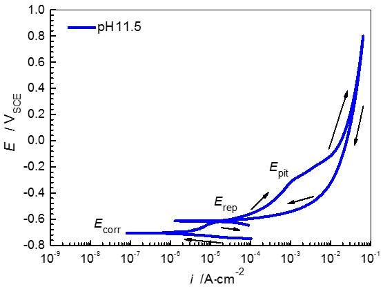 各位大侠,麻烦大家帮我看下下图中的循环极化曲线,审稿人提出了一个关于过钝化区的修改意见,我不太明白为什么要和pH相关(钢铁材料在pH11.5的碱性溶液里测试),请高手指教,谢谢! Curious about transpassive behavior. Discussion on pH would be warranted. 图片3.jpg |