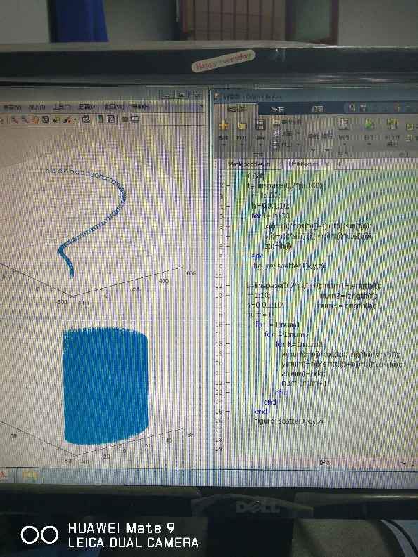 x=r.*cos(t)-r.*t.*sin(t); y=r.*sin(t)+r.*t.*cos(t); z=h; 其中,h,t,r都是变量,可以任意赋值。 画出三维散点图!! |