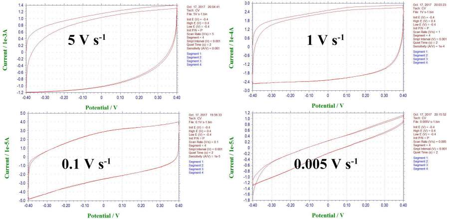 最近做了一个叉指电容器,活性材料用的是碳管,集流体是镍片,用PVA+磷酸做成固态电解质,二电极测试CV曲线,得到的曲线如图所示,可以看出来随着扫描速率的减小,CV曲线的变形越大,而且越来越倾斜,变成平行四边形。 想请教一下,这种现象好像与常理不符吧,一般来说都是扫描速率越小,曲线越接近于完美矩形吧,现在来看正好相反啊;第二个问题是,扫描速率小的时候为啥曲线向上变形啊? 未标题-1.jpg |
