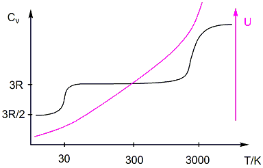 根据能量均分定律:分子的能量在其各个运动自由度(或平方项)上平均分配,每摩尔的分子在每个自由度上分配的能量为RT/2。 热容是能量对温度的偏导数,所以每个平方项贡献的热容为R/2。 常温下,分子的运动只有整体平动和整体转动的能级间距能够被充分激发,从而对热容有充分的贡献。而振动的自由度在常温下一般不被激发,所以对常温下的定容热容没有贡献。电子状态更难被激发。 所以组成理想气体的分子, 若为单原子分子,则只有平动,有x,y,z三个平方项,所以摩尔定容热容为3R/2。 若为双原子分子,则在常温下比单原子分子多两个平方项,即两个转动的平方项,所以双原子分子在常温下的摩尔定容热容为5R/2。 若为多原子分子,则在常温下比单原子分子多3个平方项,即3个转动的平方项,所以多原子分子在常温下的摩尔定容热容为3R。 |