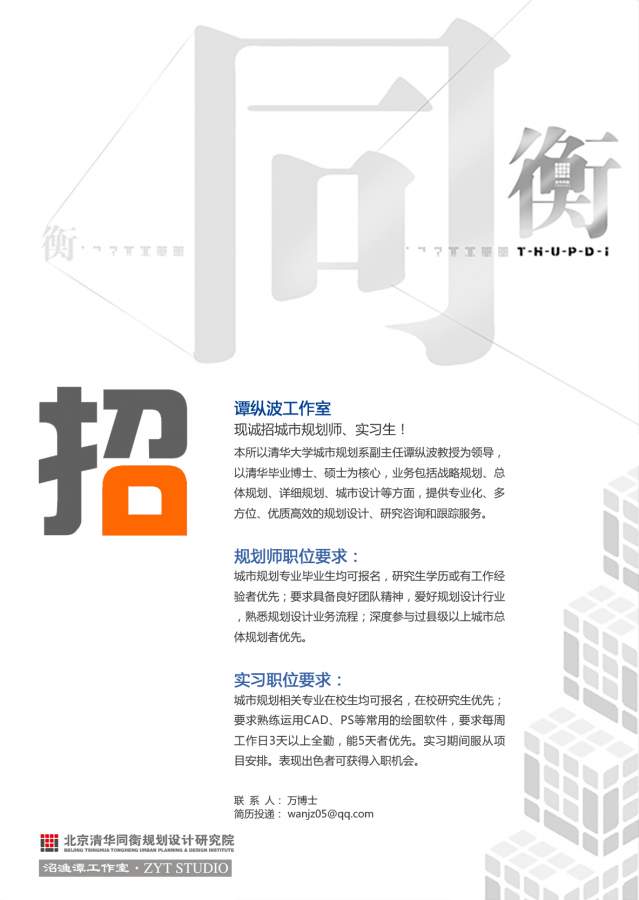 北京清华同衡规划设计研究院 谭纵波工作室 本所以清华大学城市规划系副主任谭纵波教授为领导,以清华毕业博士、硕士为核心,业务包括战略规划、总体规划、详细规划、城市设计等方面,提供专业化、多方位、优质高效的规划设计、研究咨询和跟踪服务。 规划师职位要求: 城市规划专业毕业生均可报名,研究生学历或有工作经验者优先; 要求具备良好团队精神,爱好规划设计行业,熟悉规划设计业务流程; 深度参与过县级以上城市总体规划者优先。 实习职位要求: 城市规划相关专业在校生均可报名,在校研究生优先; 要求熟练运用CAD、PS等常用的绘图软件,要求每周工作日3天以上全勤,能5天者优先。 实习期间服从项目安排。 表现出色者可获得入职机会。 联 系 人: 万博士 简历投递: wanjz05@qq.com 微信图片_20171021140850.jpg [ 来自版块群 北京 ] |