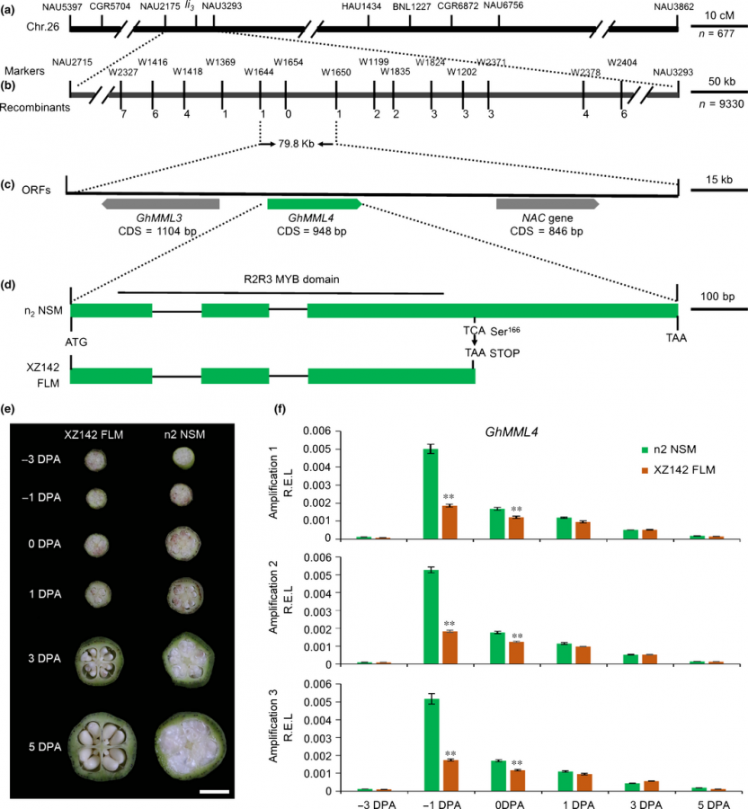 棉花是世界最重要的经济作物,棉纤维是纺织工业最主要的原料。纤维是胚珠外珠被单个表皮细胞分化发育而成的表皮毛,可以分为长绒纤维和短绒纤维两种。其中,长绒纤维是纺织原材料,具有重要的经济价值。通过配置庞大的分离群体,首次图位克隆出控制长绒纤维起始分化基因为MYB-MIXTA like transcription factor (MML) (GhMML4_D12)。 病毒诱导的基因沉默(VIGS)或降低n2NSM植株中GhMML4_D12基因的表达导致表皮细胞突起和棉纤维产量的显著降低。GhMML4_D12与GhMML3串联,GhMML3是另一个MIXTA基因,其与短绒纤维的发育有关。这两个密切相关的MIXTA基因分别与长绒纤维和短绒纤维的起始有关。它们可能调控不同类型细胞的同一代谢途径。 MIXTA进化于锦葵科,并产生了一个调控表皮细胞分化的锦葵科特异的基因家族,其与调控叶表皮毛发育的基因家族不同。棉花已形成一个独特的纤维发育转录调控网络。对调控纤维生长发育的目标基因进行鉴定与功能研究有利于探明棉花纤维发育的分子机制,从而诱导更多的表皮细胞发育成长绒纤维来提高长绒纤维产量。 棉花富含纤维素的成熟纤维,是天然纺织品的最大来源。通过图位克隆策略,我们分离的一个重要的工业棉纤维发育基因,编码一个MYB类转录因子(MML)混合染色体D12(GhMML4_D12)。病毒诱导的基因沉默或减少在n2nsm植物GhMML4_D12基因的表达导致表皮细胞突起和皮棉生产纤维明显减少。GhMML4_D12串列与GhMML3,另一个混合基因负责起毛纤维的发展。 “这两个非常密切相关的基因直接混合纤维初始生产在两个特化的细胞形态:纤维和短绒纤维。它们可能控制不同细胞类型的代谢途径。在Malvaceae的mixtas扩大它们的进化过程中,产生一个特定的家庭,锦葵科调节表皮细胞的分化,不同基因家族的调控叶毛腺毛发育。” “棉花已经开发出一种独特的纤维发育转录调控网络。对调控纤维生产的目标基因的特性提供了关于棉花纤维发育的分子机制的见解,并允许基因工程通过诱导更多的表皮细胞发展成皮棉而不是绒毛纤维来增加皮棉产量。” |