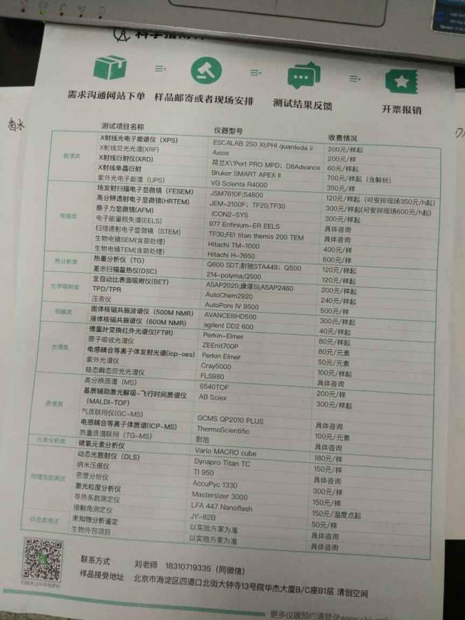 在科学指南针上做过好几回测试,有XRD,TG,BET和ICP,但没做过电镜,收费还算公道,测试速度也还算快的,就是开发票比较慢。给你张他们当时发的传单吧。 发自小木虫Android客户端 |