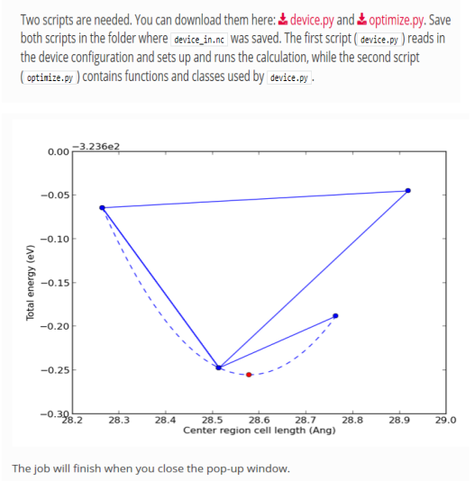 【ATK】https://docs.quantumwise.com/tut ... ice_relaxation.html Advanced device relaxation教程中说把device.py 和optimize.py 及device_in.nc放在一个目录下,运行,会自动跳出运算的结果。但是我参照教程做的并没有跳出结果。device.log 显示如下错误:IndexError : list index out of range . 请问应如何解决? 优化结构.png device.log提示错误.png |